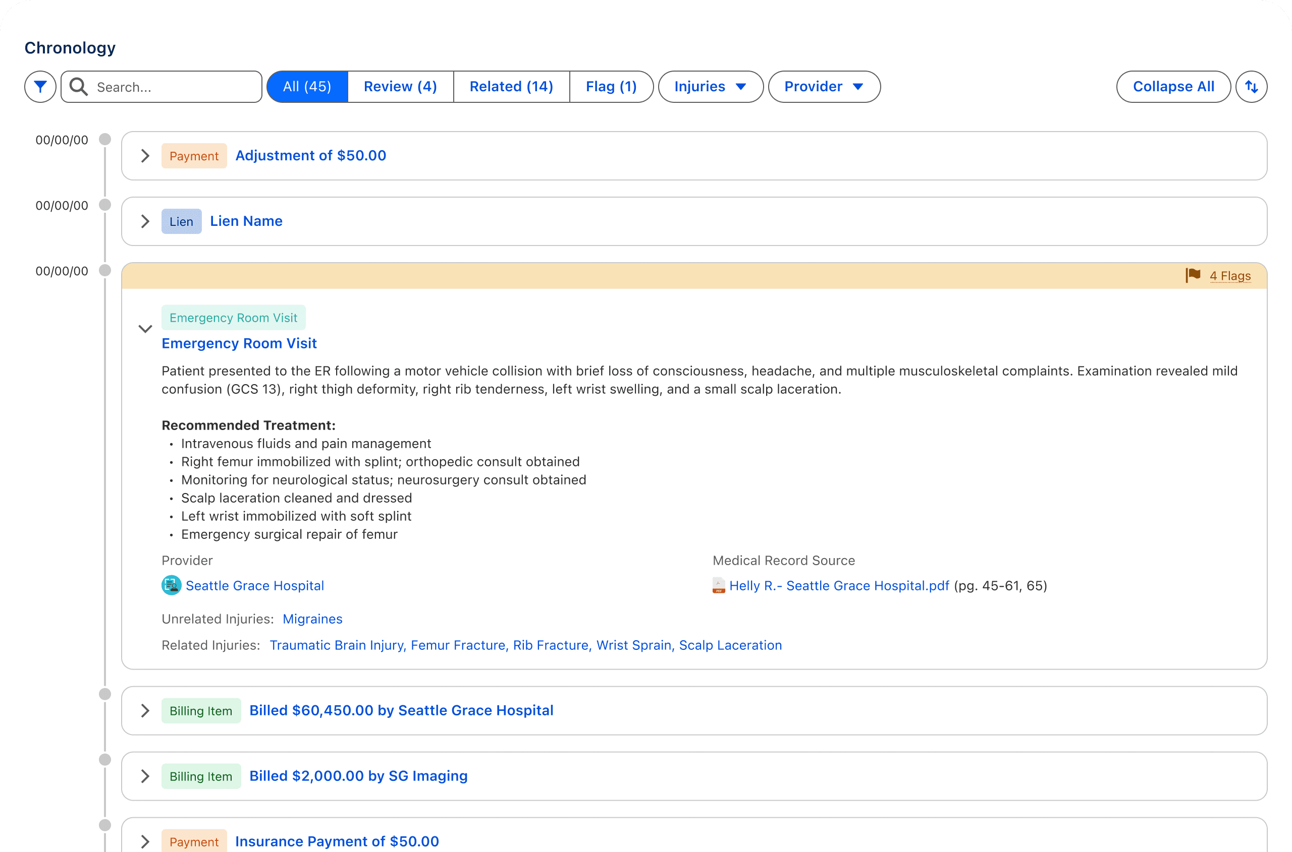 I architected a smart-flagging system configured to help users quickly assess and validate the information that matters most to the case value. Beyond simple extraction, the UI auto-surfaces alerts, such as gaps in treatment or pre-existing conditions, allowing attorneys to focus on high-value litigation strategy rather than manual data entry.